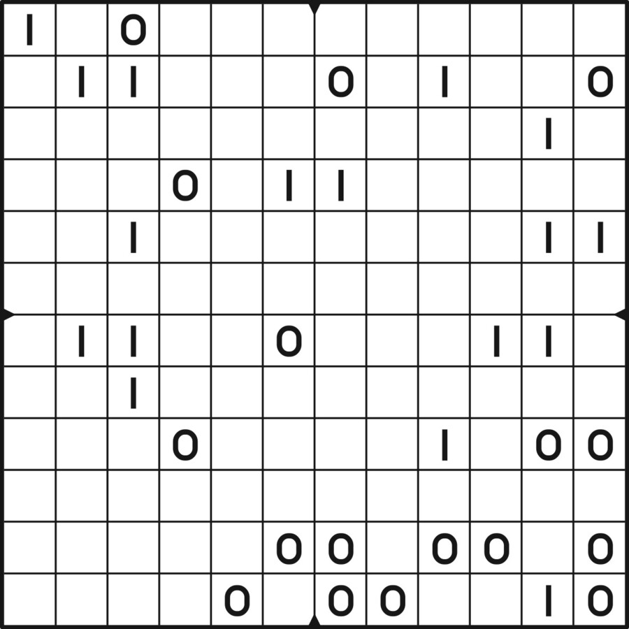 A daily binairo puzzle! Solve each puzzle with only 0's and 1's. Remember: No more than two the same numbers may be placed directly next to or below each other. Every row and every column must contain as many zeroes as ones. The combination of zeroes and ones in every row must be unique, as does the combination in each column.